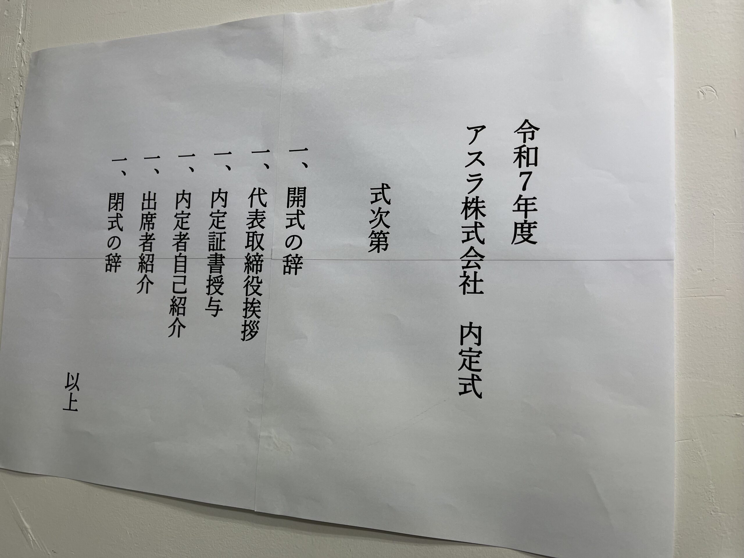 今回のブログでは、10月1日に行われたアスラ株式会社内定式について書いていこうと思います。よろしくお願いいたします。